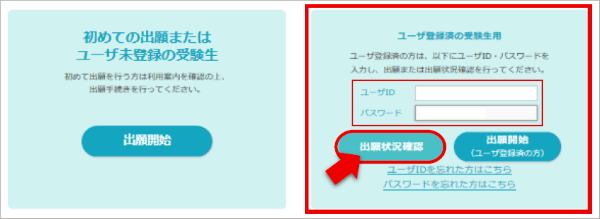 ②「出願状況確認」ボタン(※「出願開始」ボタンではありません。)をクリック