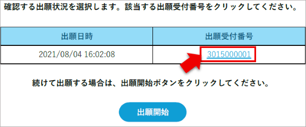 ③該当の出願日時を確認し、「出願受付番号」の「3015」から始まる番号をクリック