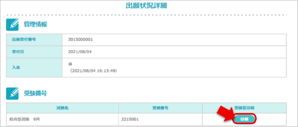 ④「出願状況詳細」の「受験番号」のエリアの「試験名」を確認し、「受験票印刷」欄の「印刷」ボタンをクリック