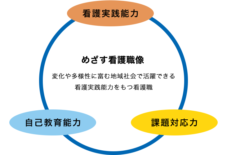 これからの看護職には、時代や社会の変化、医療の高度専門化のなかで、困難を乗り越え、先を見据え、より質の高い看護をめざすことが求められます。自己の課題や目標を明確化し目標達成し、看護専門職として生涯学び続けていく必要性を理解し、4年間の学修を通し、自ら学ぶ力を身につけます。