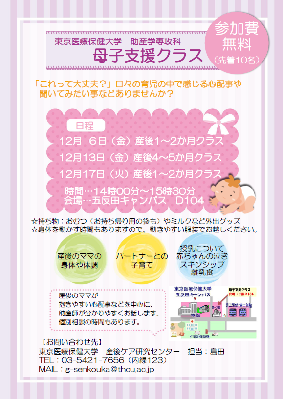 東京医療保健大学 助産学専攻科(品川区五反田キャンパス)では、毎年、地域の皆さまを対象に母子支援クラスを開催しています。