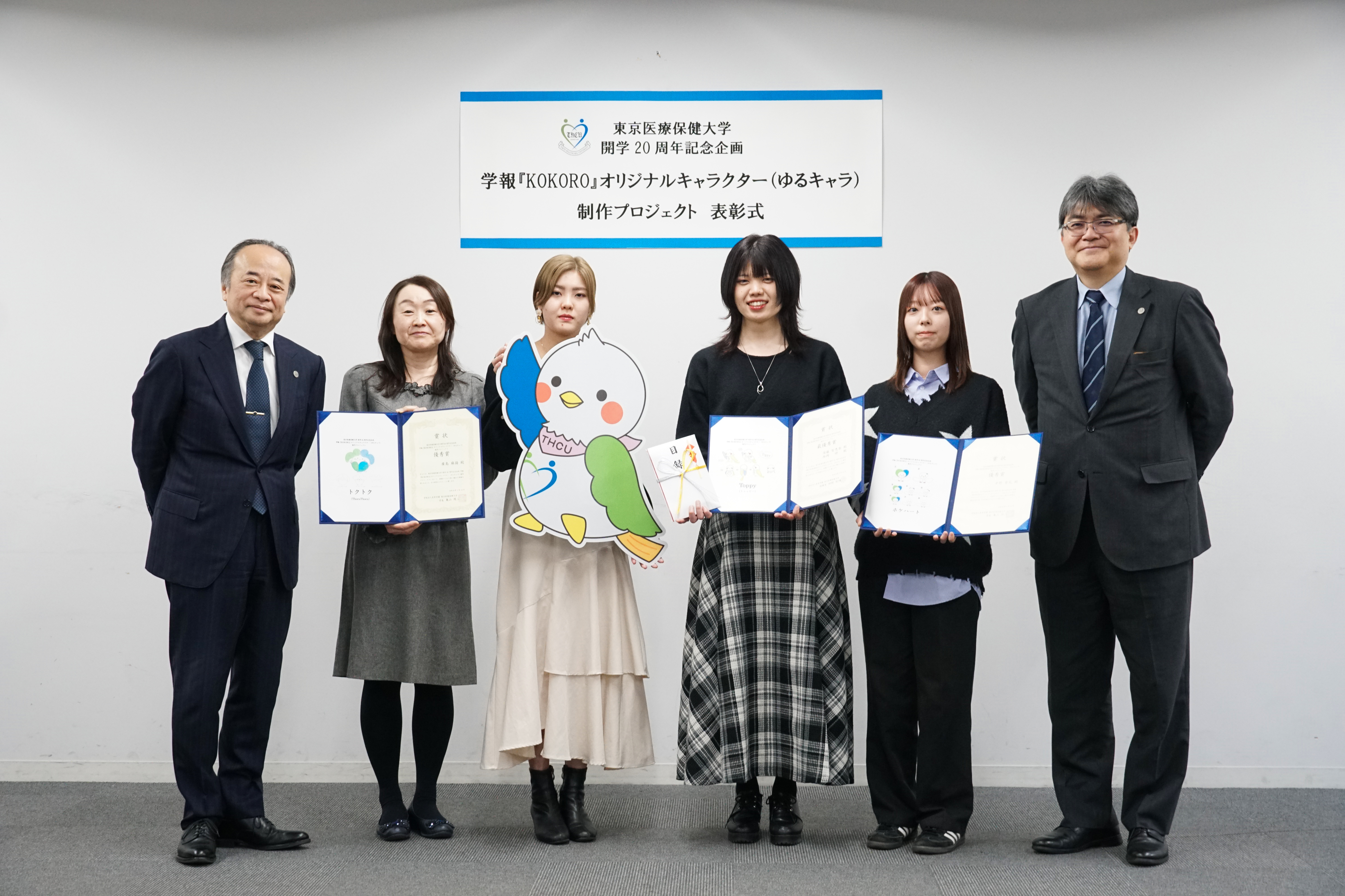 表彰式には、田村理事長、亀山学長が参加し、最優秀賞、優秀賞それぞれの受賞者に賞状と副賞が手渡されました。会場では、受賞者の功績をたたえるとともに、学生のアイデアから生まれた本学オリジナルキャラクターの誕生を祝う和やかな雰囲気に包まれました。